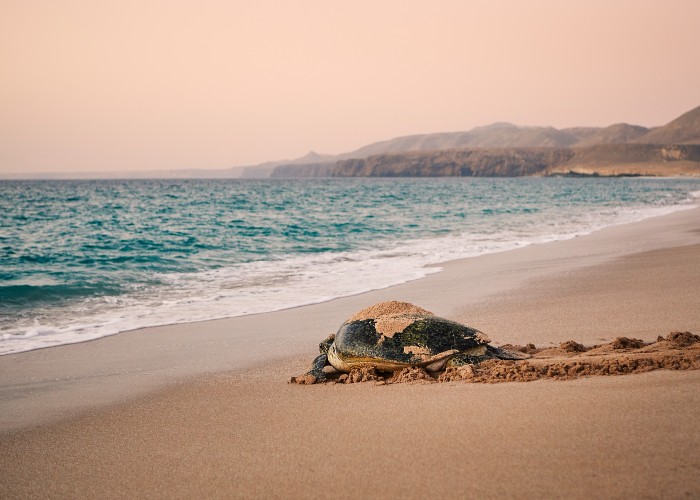Huge Green Turtle heading back to ocean after having laid eggs on beach. Unique hatching place in Ras Al Jinz, Sultanate of Oman.